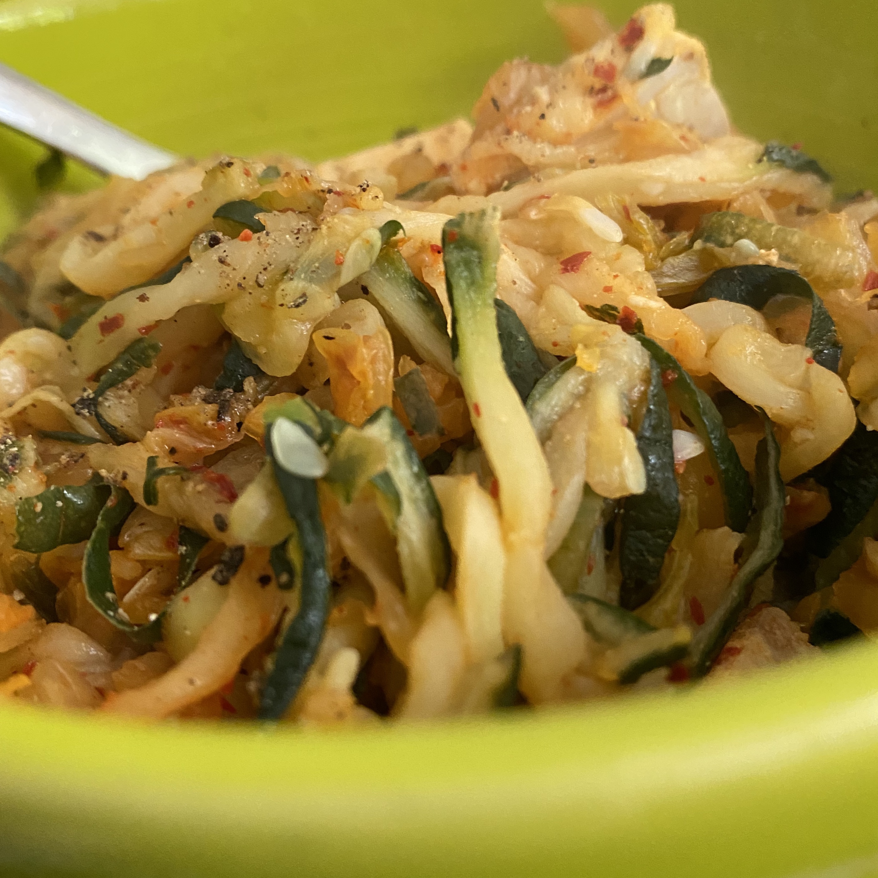 - Heat coconut oil in a non-stick pan on high and lightly sauté zucchini till al dente, then drain liquid.