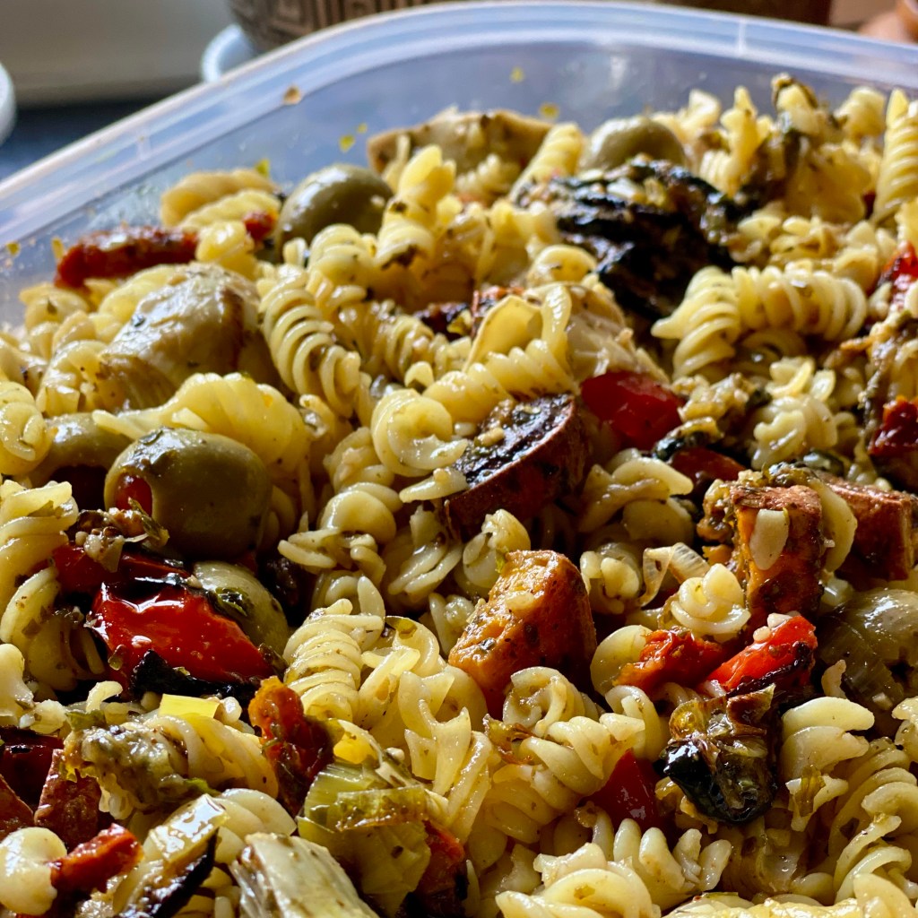 This recipe is a delightful mix of fresh, cooked, and marinated flavours. It’s delicious both hot and cold. I’ve also made it with quinoa instead of pasta, and it was equally amazing. Definitely a family favourite and a great dish to take leftovers for work lunches.