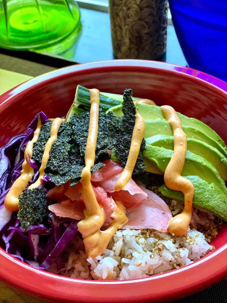 - Layer the red cabbage or greens, cucumber, avocado, and bean salad on the rice.
