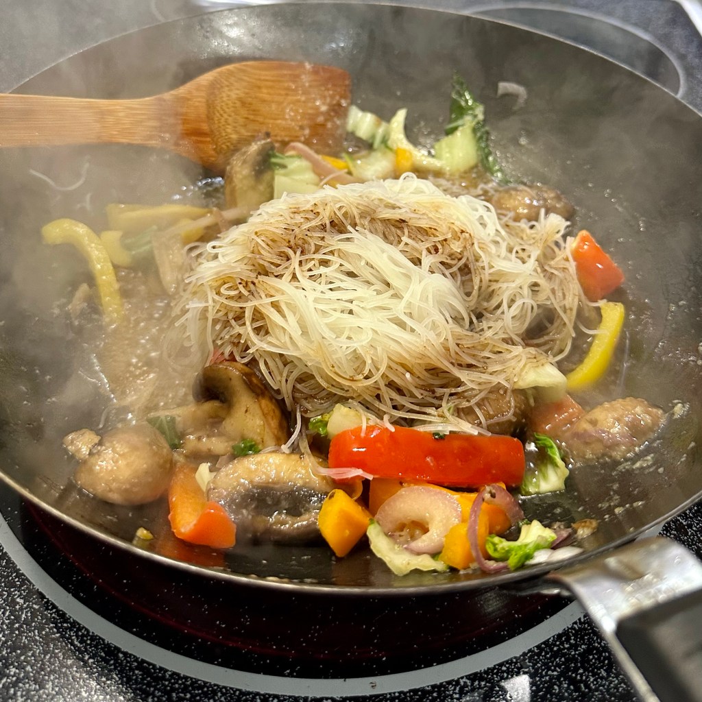 - Time to stir fry! This will go fast, so be sure to have everything prepped and on hand. Heat a a couple tablespoons of coconut oil in a wok over high heat. Stir fry the veggies, in the order of what needs the most time cooking, starting with onion, mushrooms and broccoli, and add bok choy and bell pepper once the onion is tender and mushroom is starting to brown. Add ginger and garlic, the half cooked noodles, and about 1/4 cup of the sauce and simmer until noodles are tender, but bell peppers are still a bit crunchy. This will only take about 2-3 minutes.
