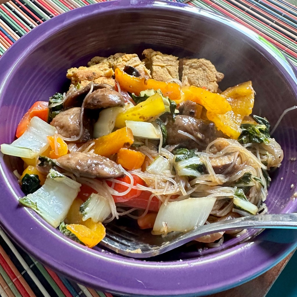 - Chickpea “tofu” (~1.5 hour prep time):** Lightly oil an 8×8″ baking dish; set aside. Whisk 1 cup chickpea flour, 1 teaspoon ground turmeric, 1¼ tsp. salt, and 1 cup water in a large saucepan. Let sit 10 minutes to hydrate, whisking occasionally to break up any lumps. Whisk in 2 more cups water. Heat over medium high, whisking often to prevent lumps from forming, and bring to a simmer. Cook, reducing heat as needed to maintain a gentle simmer and stirring with a wooden spoon (be careful to avoid any spattering as the “tofu” cooks), until very thick and beginning to stick to bottom of pot, 6–8 minutes. At this point, there should be a thin film on the bottom of pot, which means you are there. Pour into prepared baking dish and smooth top. Let cool until set in the refrigerator about 30 minutes. Dice into bite size pieces. Marinate in stir fry sauce for about 20 minutes. Drain and save sauce for the veg stir fry. Fry in 2 Tablespoons of coconut oil over high heat till crispy and browned. Serve on top of stir fry veg and noodles