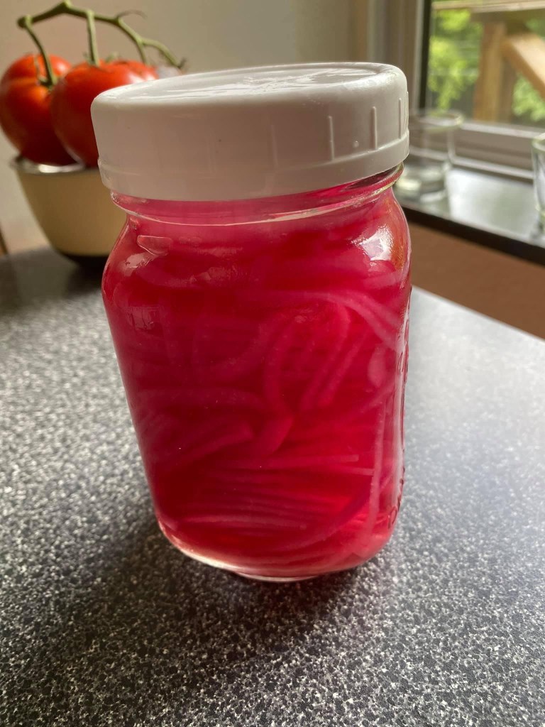 Pickled red onions are amazing on salads, sandwiches, burgers, pasta salad, etc…
