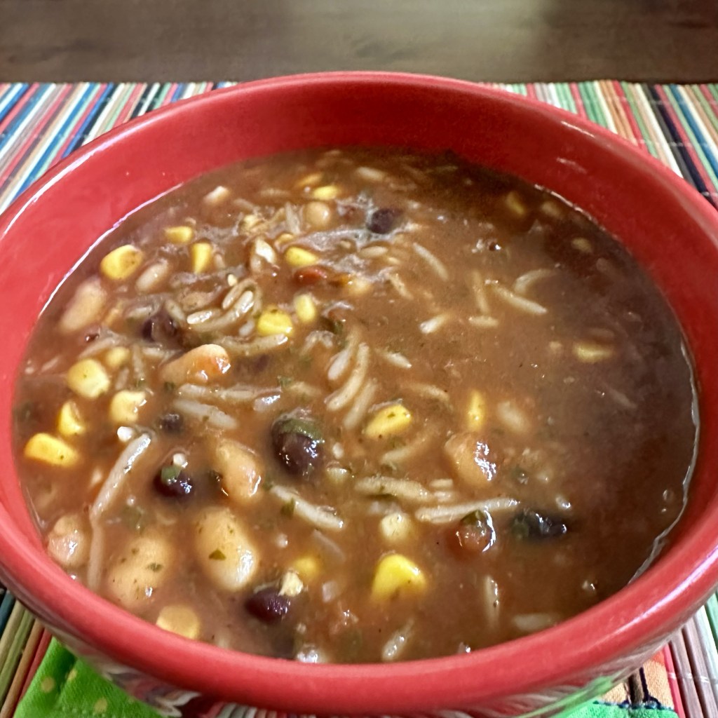 Last winter I was clearing out my pantry and found a couple cans of whole corn that I bought accidentally instead of creamed corn. I threw together a quick Mexican bean soup to use them up, but never wrote down the recipe, because I was just using up ingredients I don’t normally keep on hand. Then recently my auntie asked me to make it again… Oops! Had to make it up again. This time I’m writing it down and adding it to our regular rotation!