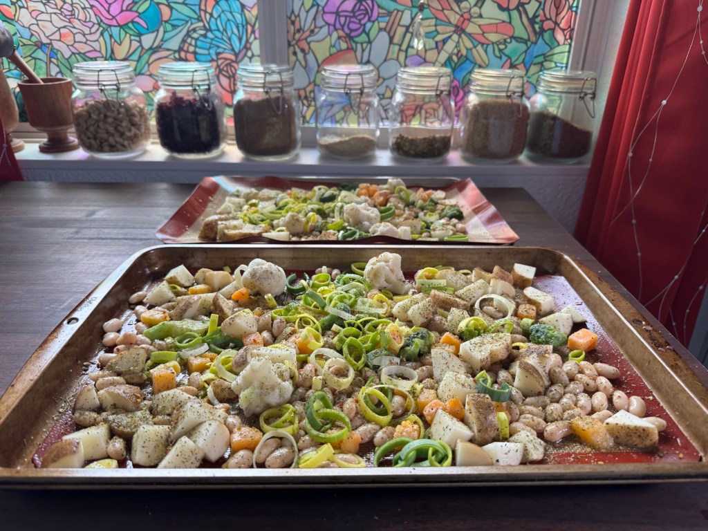 - Spread the veg and beans out on the sheet trays so nothing is overlapping.