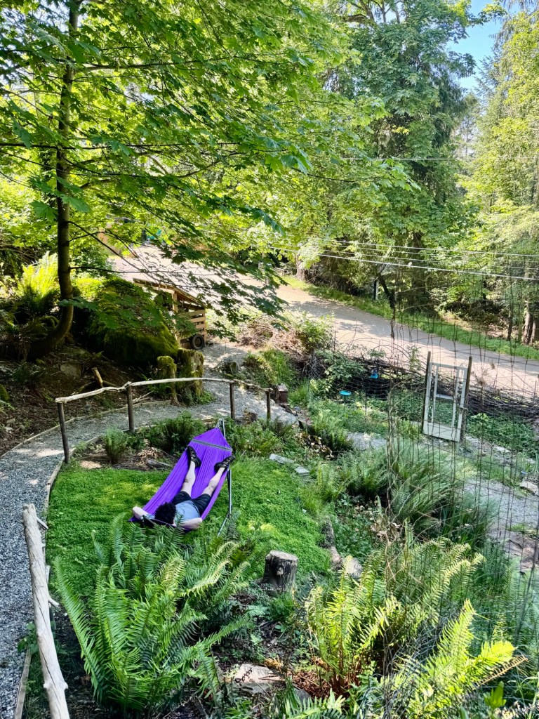 Today the weather started feeling more summer than spring, so the new clover lawn was deemed ready for a debut hammock trial. After a busy morning spreading gravel and weeding, Mr. B has finally reaped the rewards of his hard labour, and reported the new hammock location is a roaring success.