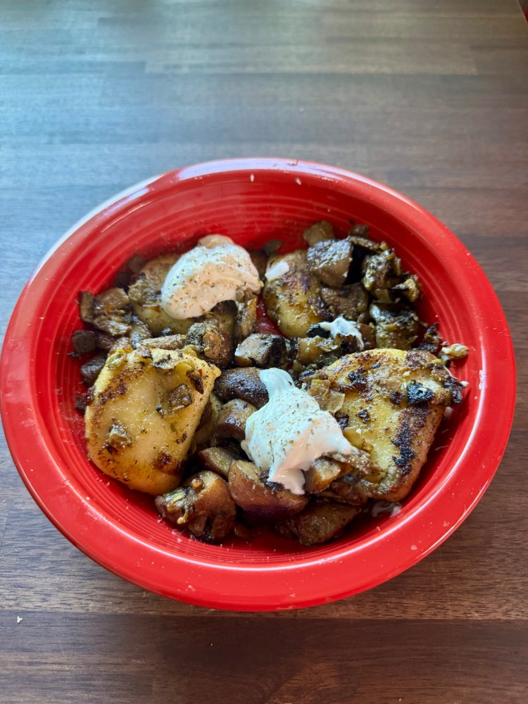 6. Serve perogies with the mushroom and onion pesto mixture, top with a couple globs of sour cream, and season with salt and pepper. Enjoy hot!