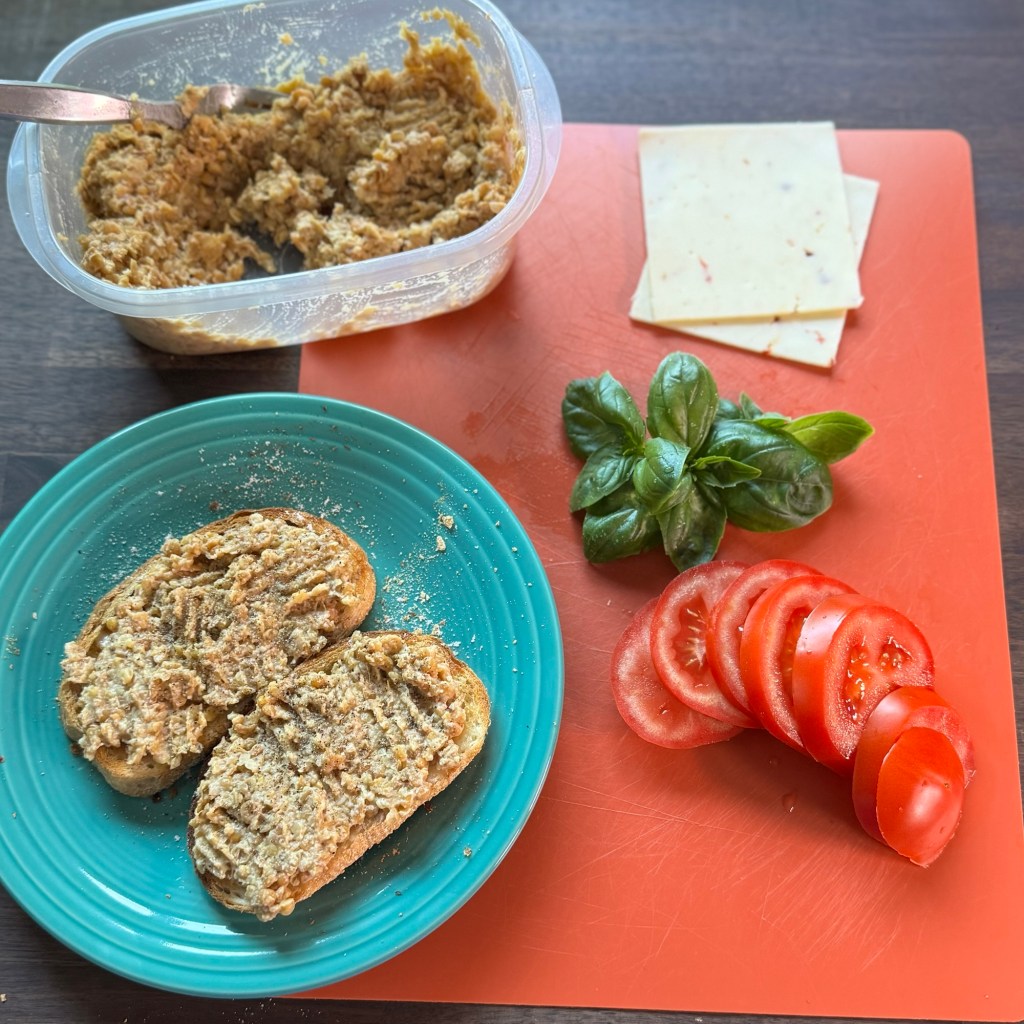 - To make one open faced sandwich spread the mash on both sides of buttered toast, layer the fresh basil, cheese slices, tomato slices, and pickled red onion, then add salt & pepper to taste.