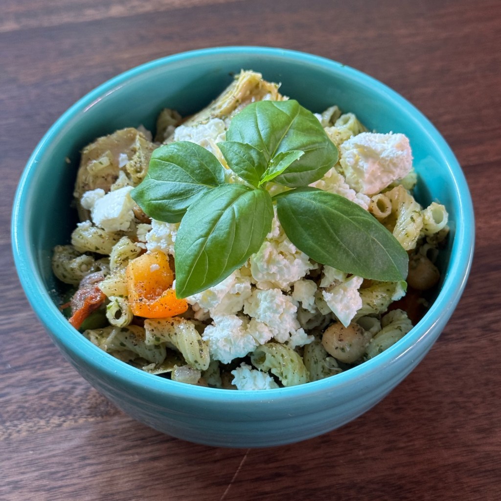 This is a more summery version of my well loved autumnal Arti-tom Chick-feta Pasta salad recipe. I have 9 basil plants in my hydroponic window ledge grower, so I’m on my third batch of pesto so far this summer. I am also growing sugar ann peas in grow bags on my deck, and they are so sweet and crunchy, so I harvested about a cup of them and added them to this salad. Obviously you can buy pesto and sugar peas, but if you have a surplus from your garden, this is the perfect salad to add your harvest, and feel free to swap out your garden favourites – it would be amazing with fresh vine tomatoes instead of the sundried tomatoes too, but I would add them to each serving rather than to the whole pasta salad.