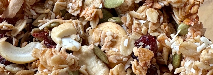 This batch has pecans, pumpkin seeds, sunflower seeds, craisins, and sweetened coconut shreds. I love a sweet nutty chunky granola, but I’m tired of paying ridiculous prices to buy it, so here’s my homemade version... It’s pretty quick and easy to prepare. (Source: Adapted from CookieandKate.com) Ingredients: 4 cups gluten free rolled oats1 + 1/2… Continue reading Chunky Granola Recipe